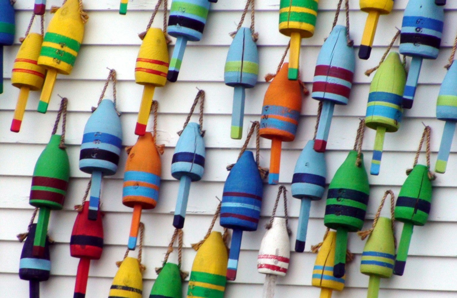 This photo shows wooden lobster fishing buoys decorating the side of a small shack near the ocean in Maine. Each fisherman has a unique pattern for their personal buoys, in terms of colors and number of stripes. That way when they pull up their traps at the end of the day, they can be sure to get their own and not something belong to another person. It was taken by my wife on a vacation trip in Maine in August 2009, and was used by her in a custom calendar she ordered for the following Christmas for family members. The specific site was the bay in the town of Stonington. Family relatives liked the mix of bright colors in the picture. I have a friend whose 88 year old mother enjoys putting together jigsaw puzzles. She assembles a new puzzle every two or 3 days, and currently has about 150 puzzle boxes in her home. I ordered this photo-based puzzle as a possible gift for her. I have tested out the puzzle myself and was able to put it together, so now I will pass it on. It helped me to have a photo with numerous small regions with different colors, and edges for the building tiles or buoys that were at a slight angle to horizontal or vertical. It also helped to know that the pattern for the puzzle cutting produces four separated pairs of two columns each, with alternating 3-knob or 3-pit shapes in each of those columns. Completing those columns early on helped solve the puzzle by dividing it into smaller regions with some certainty, and created a lot of exposed edges for matching with remaining unplaced pieces.